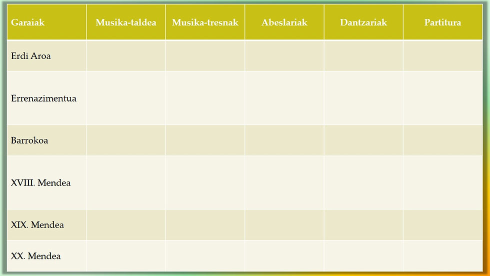 Gero, klikatu honako botoiak garai bakoitzeko arte-lanak behatzeko eta aztertu horietan agertzen diren musika-tresnak edo musika elementuak zure koadernoan honako taula betetzen: